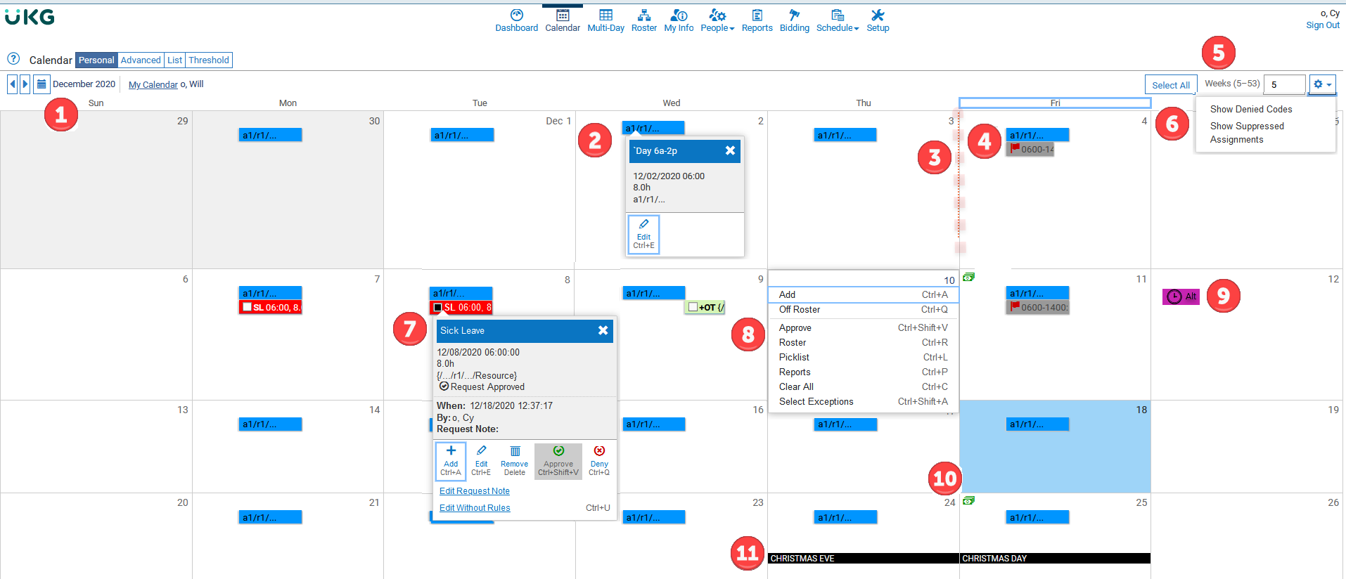 The personal Calendar 1displays scheduling activity, such as working days, overtime, leave exceptions, sign-ups, and special event job opportunities.
